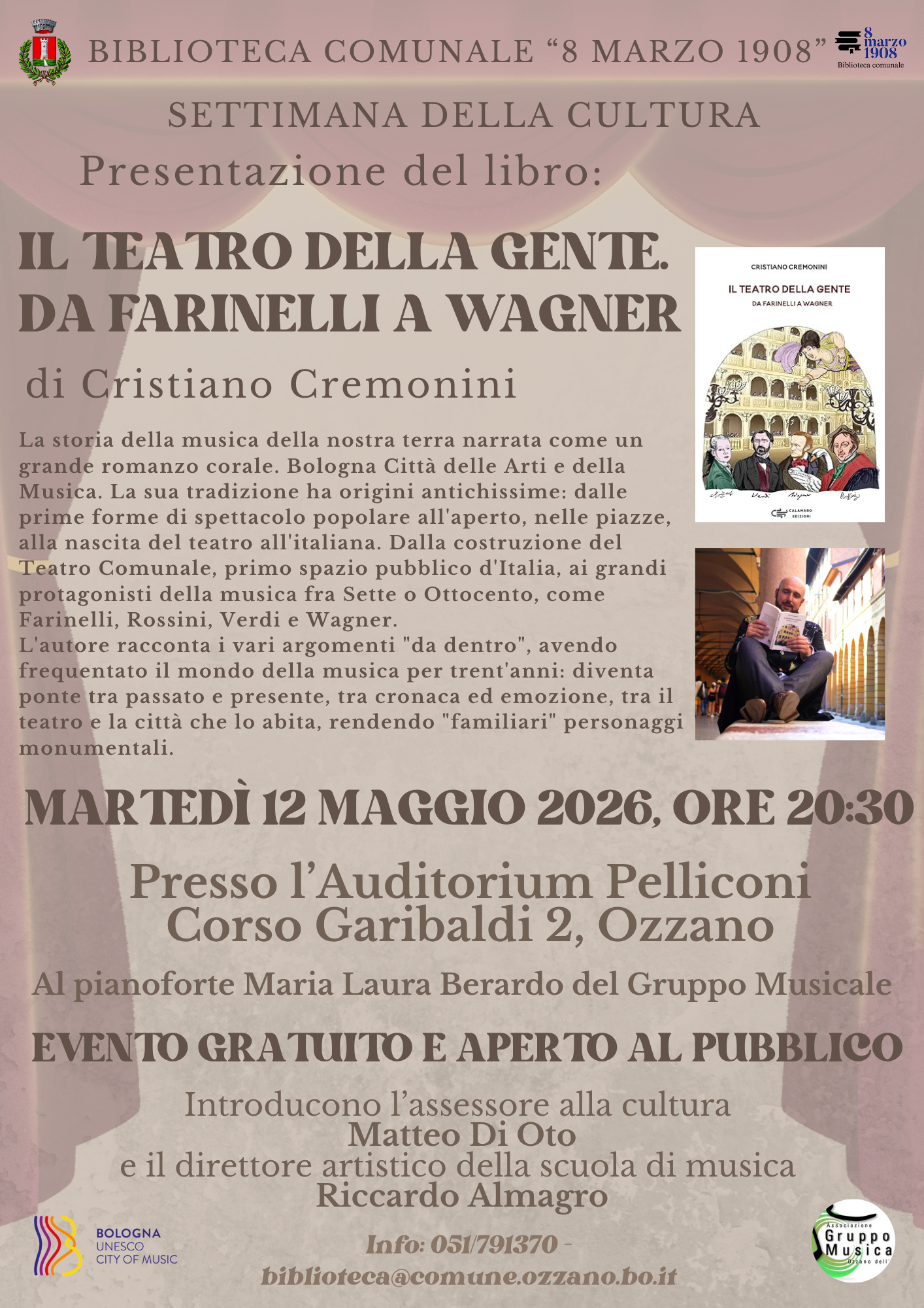 12 -ore 20,20 presentazione deli libro di Cristiano Cremonini "Il teatro della gente: da Farinelli a Wagner", con accompagnamento al piano di M.L. Berardo - Auditorium Pelliconi