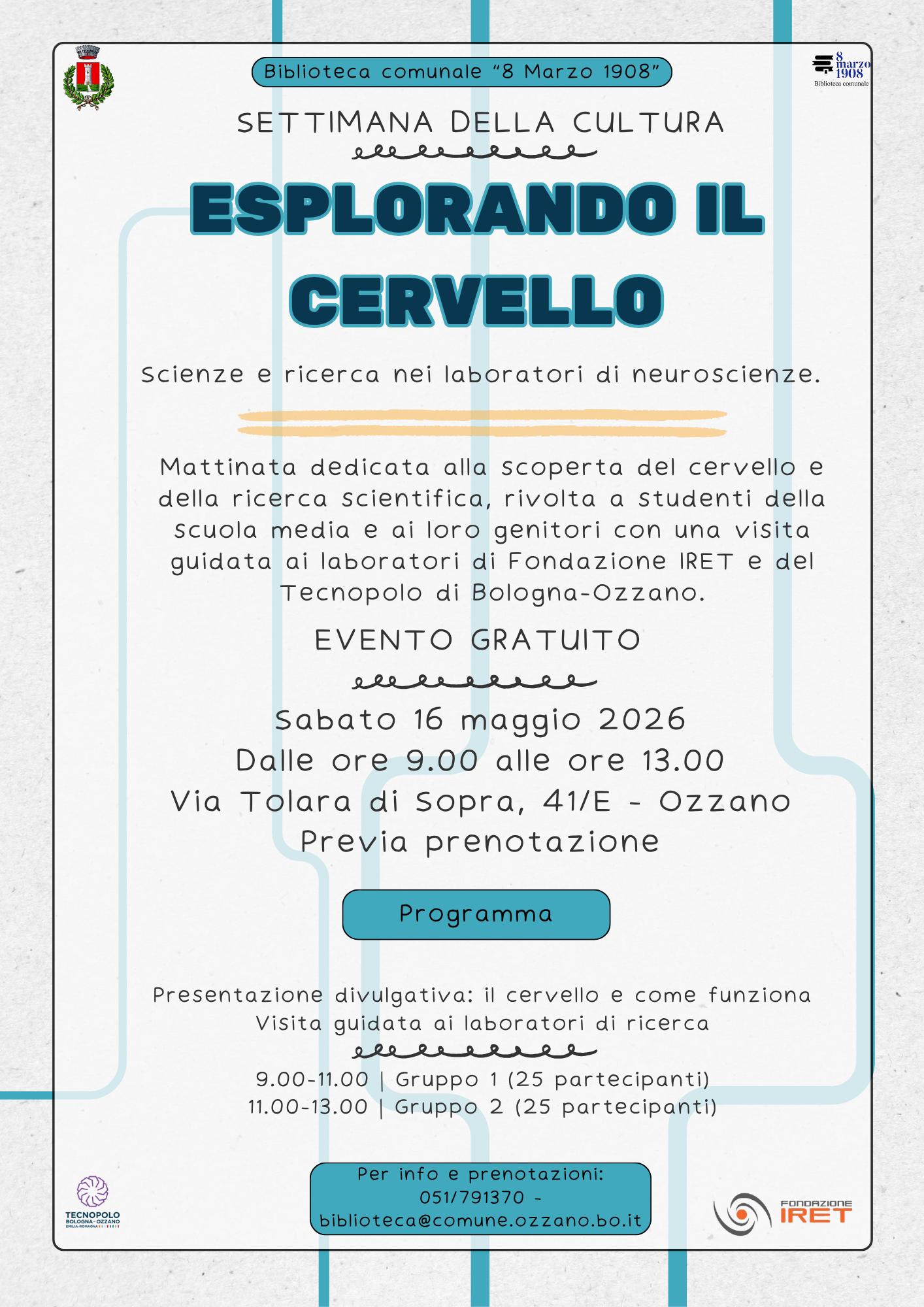 16 - ore 9 "Esplorando il cervello", laboratorio e giornata divulgativa per ragazzi - Fondazione IRET (via Tolara di Sopra, 41/E (prenotazione obbligatoria)