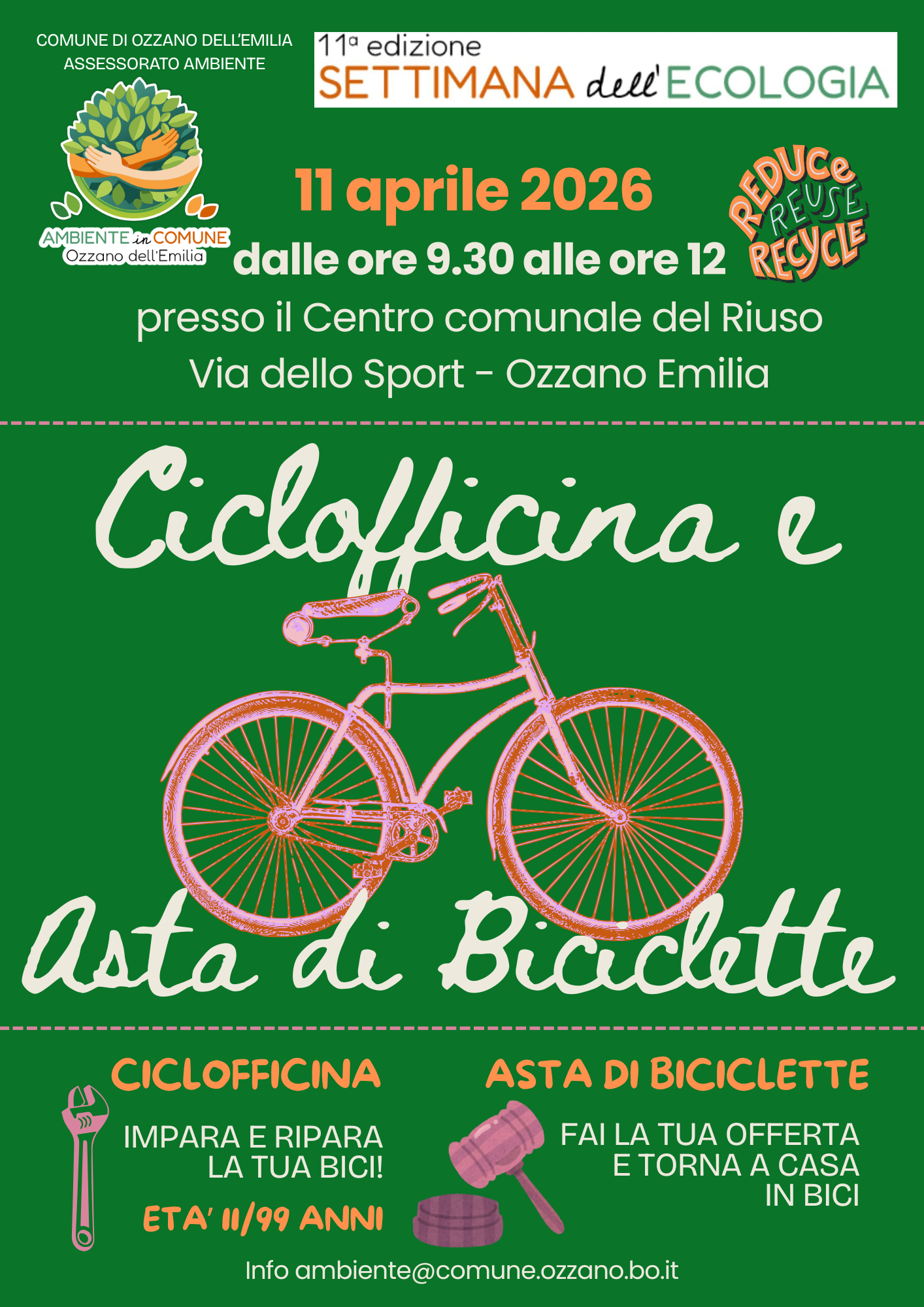 - Si parte Sabato 11 aprile 2026 con un appuntamento mattutino dedicato al Centro comunale del Riuso e uno scambio intergenerazionale sui saperi: Arnaldo, con la Ciclofficina, ci mostrerà come riparare la nostra bici (età consigliata dagli 11 ai 99 anni!). A seguire Asta di Biclicette per rimettere in circolo bici piccole e grandi che meritano una seconda vita e l'invito a muoversi in modo più salutare e sostenibile! Scarica il volantino sotto riportato