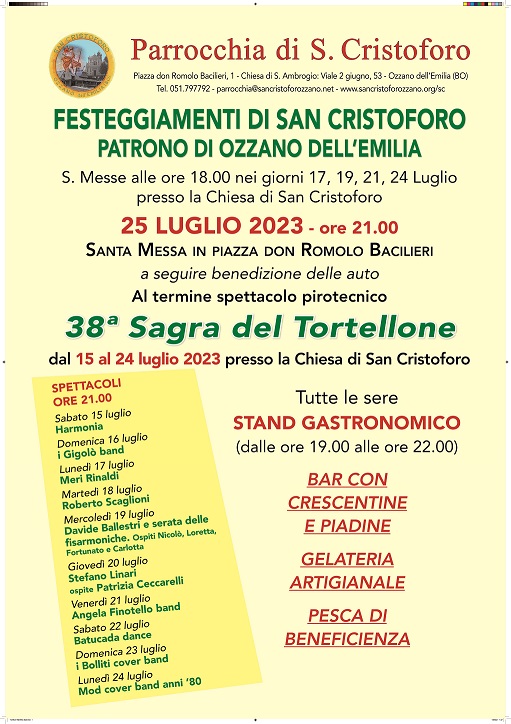 La sagra del tortellone di San Cristoforo (Patrono di Ozzano dell'Emilia) si svolgerà dal 15 al 24 luglio, ed è un appuntamento assolutamente da non perdere dedicato a tutti i buongustai ed agli amanti di questa pasta ripiena.