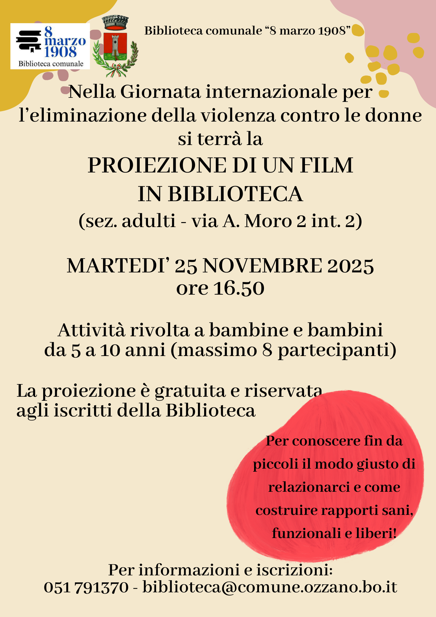 • 25/11/2025 alle ore 16,45: Proiezione film d'animazione per bambini/E in occasione della giornata contro la Violenza sulle Donne - dai 5 ai 10 anni max 8 iscritti presso Biblioteca sezione Adulti Via A. Moro, 2 Int. 2 - Ozzano Emilia  (prenotazione tel. 051791370 - email biblioteca@comune.ozzano.bo.it)