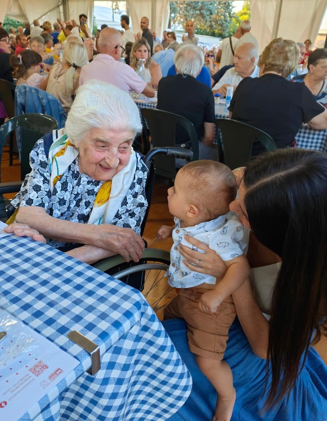 L'appuntamento di lunedì 14 luglio nell'ambito della Sagra del Tortellone, presso la parrocchia di San Cristoforo ha visto la partecipazione di oltre 300 persone, tra cui Dina Cavrini, l’ozzanese ‘doc’ più anziana con i suoi 100 anni e 8 mesi, abbracciare con affetto il più giovane nativo, il piccolo Emanuele Sazzini di appena 8 mesi.