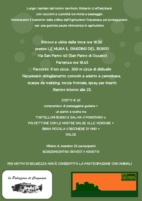 Venerdì 8 agosto, in collaborazione con l'agriturismo La Palazzina di Ciagnano, con partenza dal giardino de Le Mura, dopo aver visitato la Torre medievale di San Piero, per chi lo desidera, alle 18,45 ci si incamminerà lungo un percorso dove un tempo si coltivavano gli ulivi, per raggiungere al tramonto il viale dei mandorli nel punto più alto della coop Dulcamara. Da lì si potrà osservare il sole che scende dietro a S. Luca, per poi raggiungere la Terrazza della Palazzina di Ciagnano per assaporare le loro specialità estive. Poi, alla sola luce delle lampade frontali o alternative, si raggiungerà nuovamente il Borgo di S. Pietro.