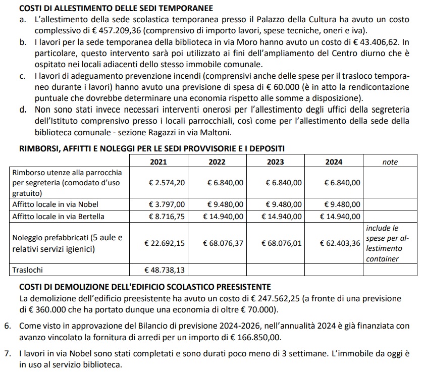Non sono stati invece necessari interventi significativi per l’allestimento degli uffici della segreteria dell’Istituto comprensivo presso i locali parrocchiali, così come per l’allestimento della sede della biblioteca comunale - sezione Ragazzi in via Maltoni.