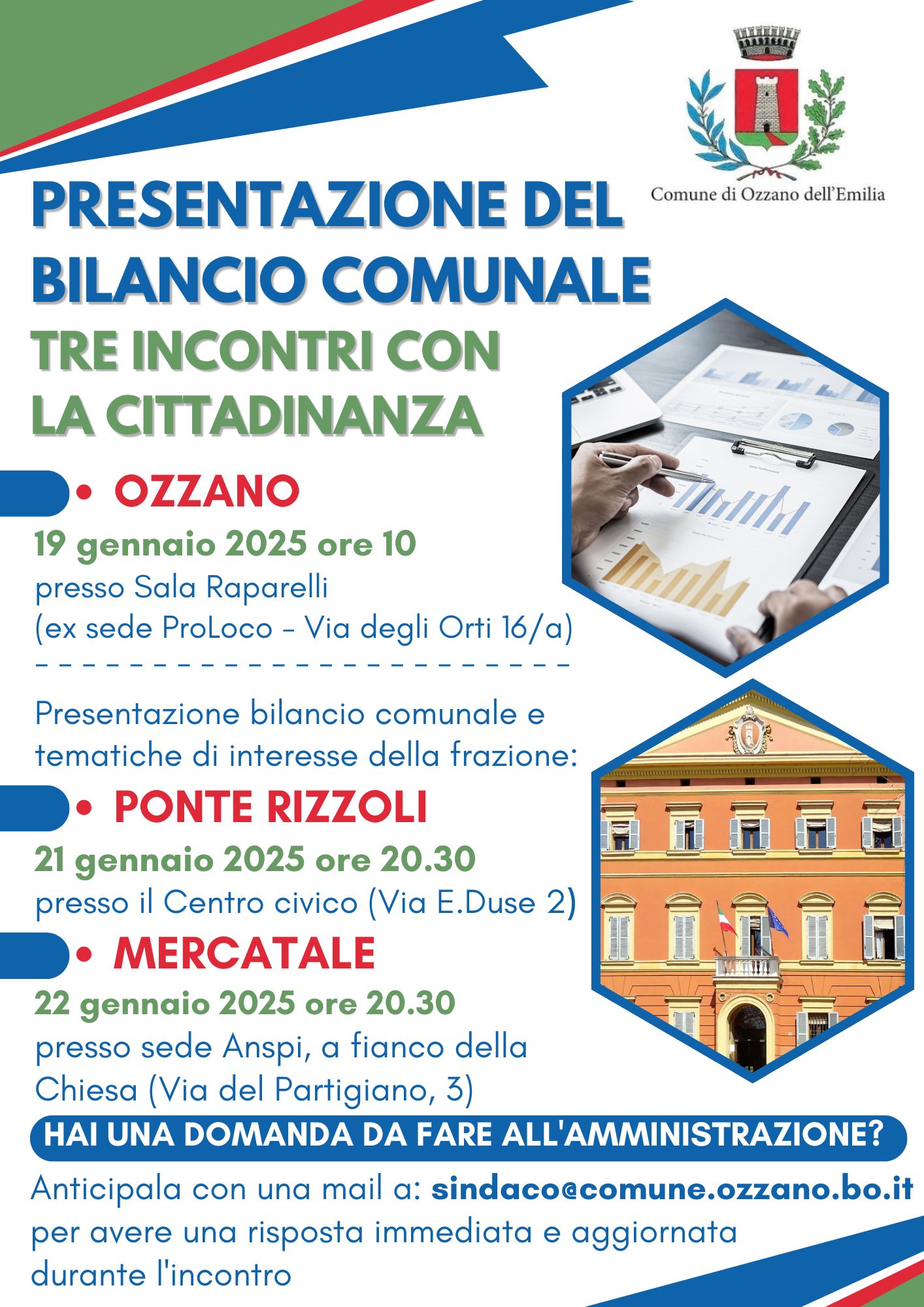 Chiunque avesse delle domande da porre all’Amministrazione può anticiparle inviando una mail a sindaco@comune.ozzano.bo.it per avere una risposa immediata e aggiornata nel corso dell’incontro. E’ importante che chi scriva indichi la riunione alla quale intende partecipare.