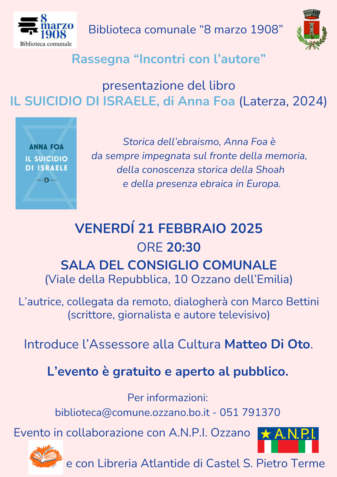 Venerdì 21 febbraio l'autrice (Anna Foa), collegata da remoto dialogherà con Marco Bettini (autore televisivo, scrittore e giornalista)