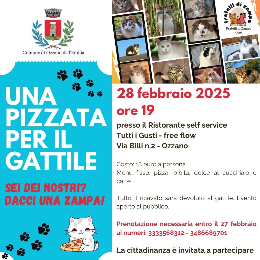 OZZANO - ‘Una pizzata per il gattile' è l’iniziativa promossa dal Comune di Ozzano dell’Emilia per l'associazione Fratelli la Zampa che gestisce la struttura che ospita un centinaio di gatti ed è stata recentemente presa di mira da ladri.
