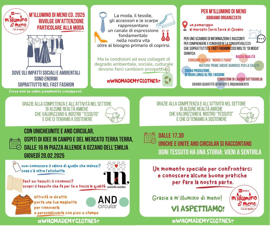 In linea con il tema della settimana del risparmio energetico (M'Illumino di meno: 16-21/2/2025), quest’anno dedicata a promuovere azioni virtuose di riuso degli abiti contro gli sprechi e i consumi del fast fashion, il nostro Comune - Assessorato all'Ambiente - in collaborazione con Idee in campo, UnicheUnite e And Circular ha organizzato - all'interno del Mercato Terra Terra - un momento di approfondimento rivolgendo un'attenzione particolare proprio alla moda il cui impatto ambientale e sociale (soprattutto del fast fashion) è enorme.