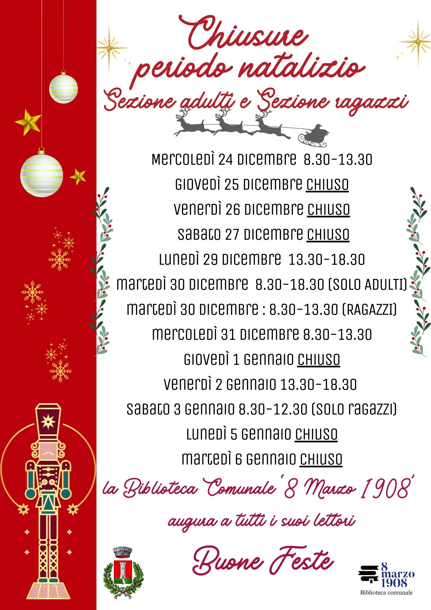 - 24/12/25 apertura dalle ore 8.30 alle ore 13.30