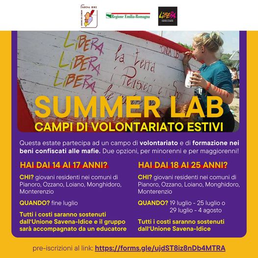 Anche quest'anno l’Unione dei Comuni Savena Idice apre le iscrizioni per il campo di impegno e formazione nei terreni confiscati alle mafie organizzato dall’Associazione Libera, con due opzioni: 14-17 anni o 18-25 anni, per ragazzi/e in partenza dai Comuni dell'Unione.