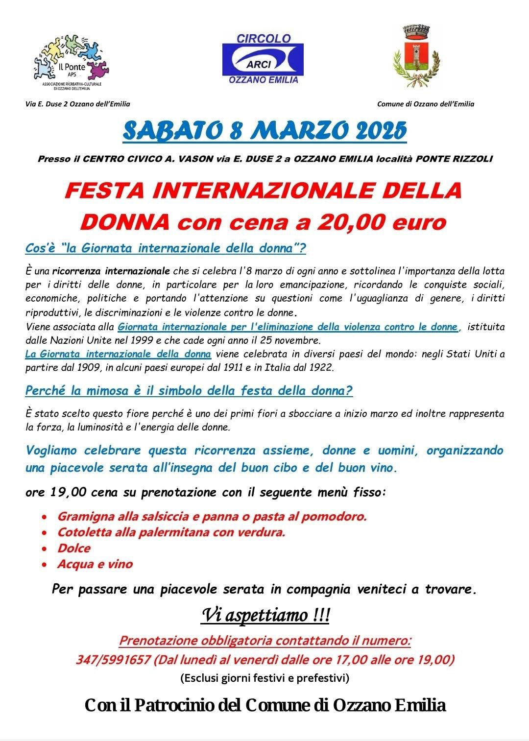 - 8/3/25 alle ore 19: Cena presso il Centro Civico A.Vason (Via E.Duse 2-Ponte Rizzoli-Ozzano)- Info e prenotazioni cell. 3475991657 (dal lunedì al venerdì dalle ore 17 alle ore 19 tranne festivi e prefestivi)