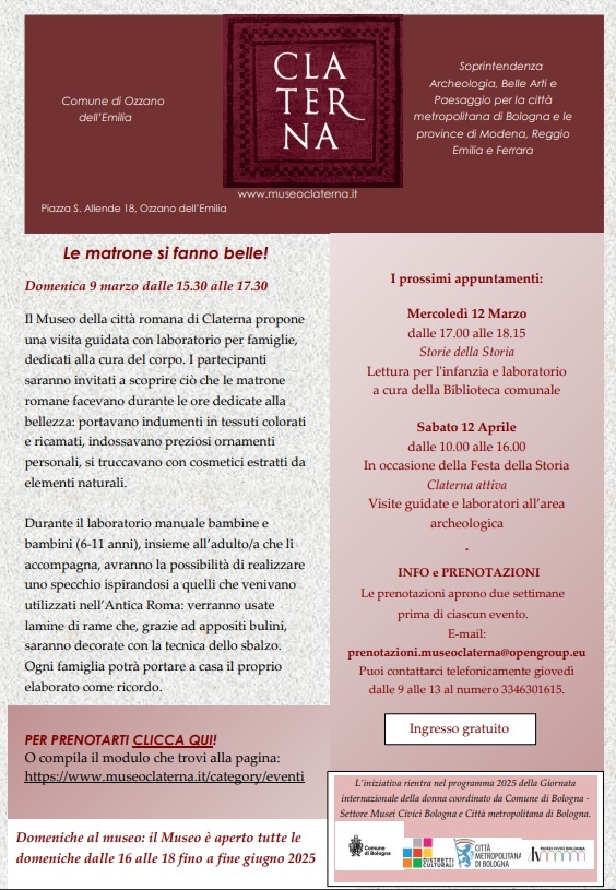 - 9/3/25 dalle ore 15.30 "Le matrone si fanno belle" . Apertura straordinaria del Museo della Città romana di Claterna (Piazza Allende, 18 - 40064 Ozzano): visita guidata tematica e laboratorio per famiglie www.museoclaterna.it - prenotazioni.museoclaterna@opengroup.eu