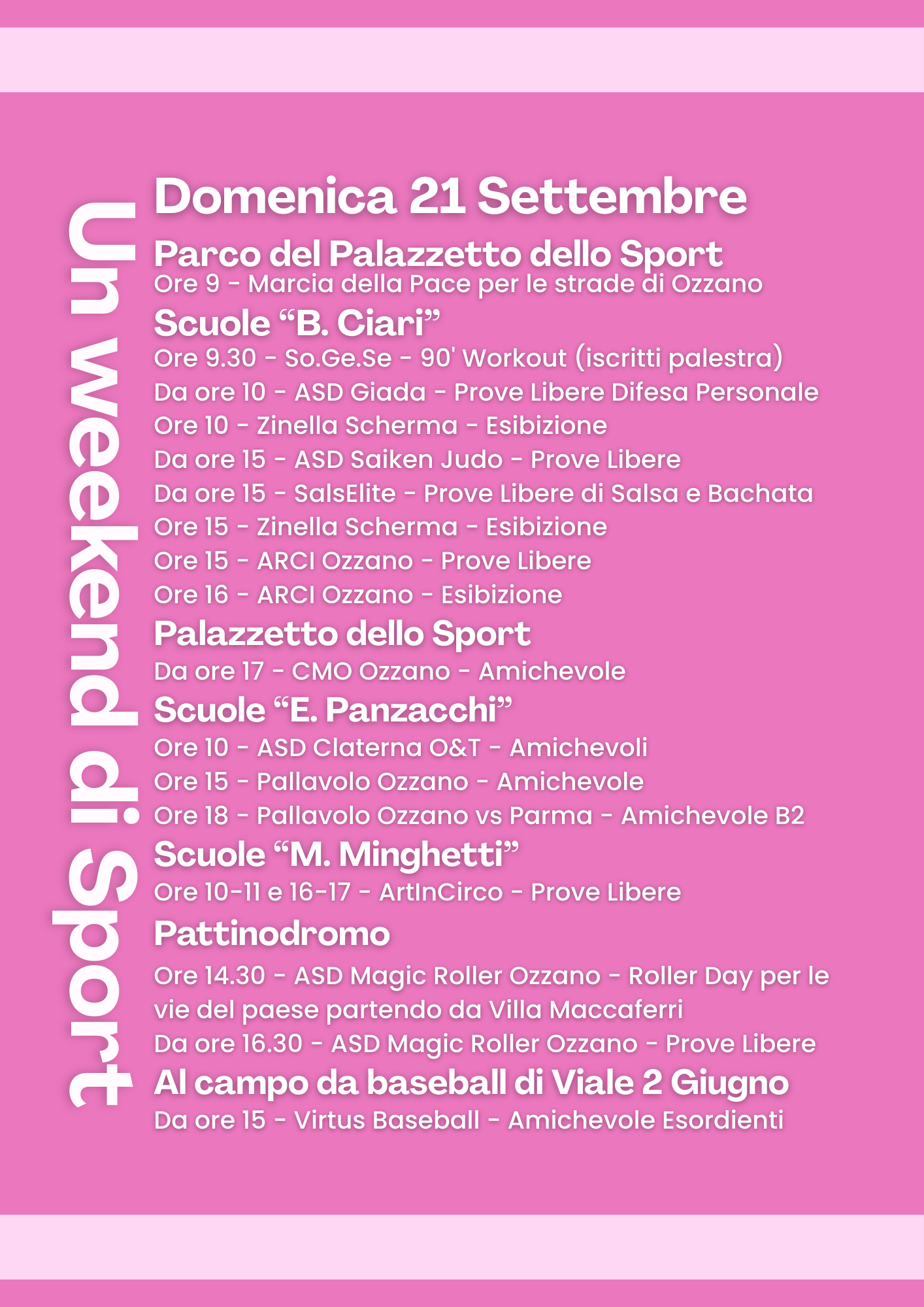 Molte le discipline presenti (pattinaggio, baseball, basket, workout, etc..) e gli impianti coinvolti (palazzetto, palestra Ciari, palestra scuole Minghetti, nuova palestra scuole Panzacchi, pattinodromo, campo baseball viale II Giugno).