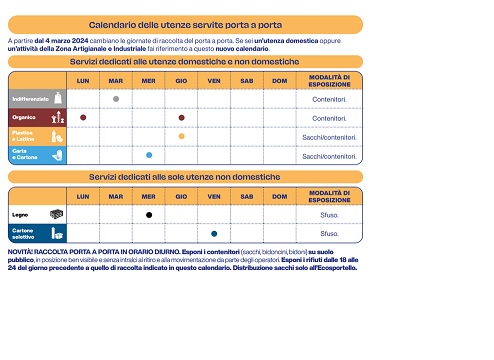 Si ricorda alle utenze interessate dal Servizio di Raccolta "porta a porta" che dal 4 marzo sono in vigore le seguenti modalità: