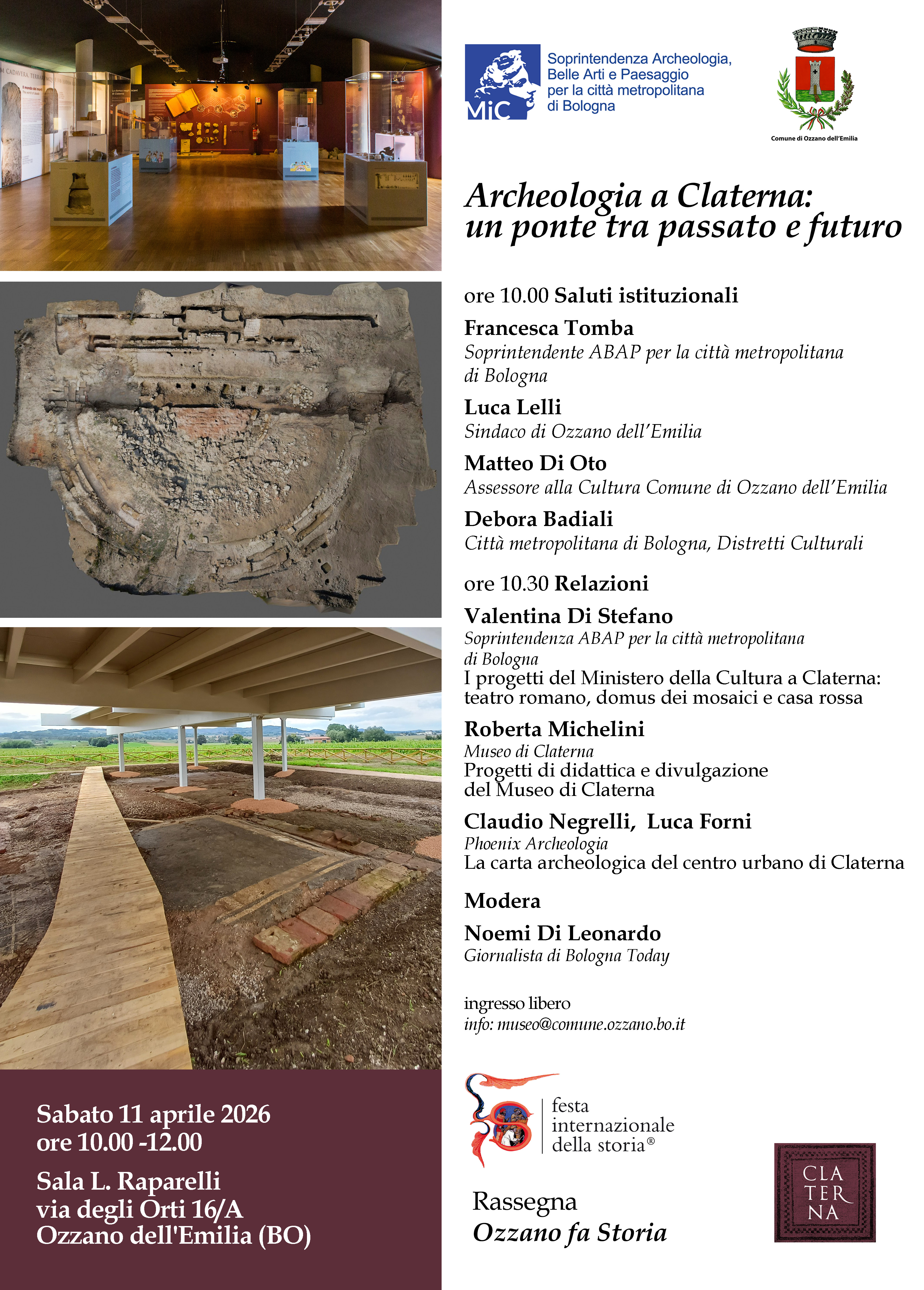 Si parte l’11 aprile 2026 con la conferenza dal titolo "Archeologia a Claterna: un ponte tra passato e futuro" in cui verrà presentato il progetto attivato dalla Soprintendenza ABAP-BO sul sito della città romana. Un progetto iniziato nel 2022 con fondi ministeriali, che vede indagini a 360 gradi e la valorizzazione delle scoperte e degli studi più aggiornati, anche attraverso un’ampia attività di divulgazione. Scarica il volantino sotto riportato