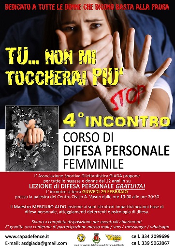 L'Associazione dilettantistica Giada promuove, ogni ultimo giovedì del mese, per ragazze e donne, una Lezione gratuita di autodifesa personale femminile.