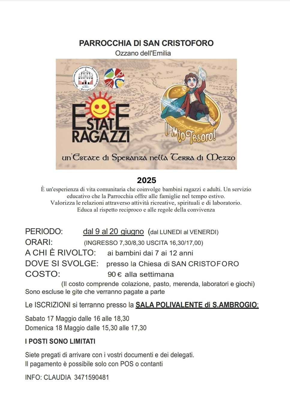 In previsione della fine dell'anno scolastico, la Parrocchia di Ozzano informa le famiglie della proposta di Estate Ragazzi per il 2025. Il periodo va dal 9 al 20 giugno, per ragazzi dai 7 ai 12 anni.