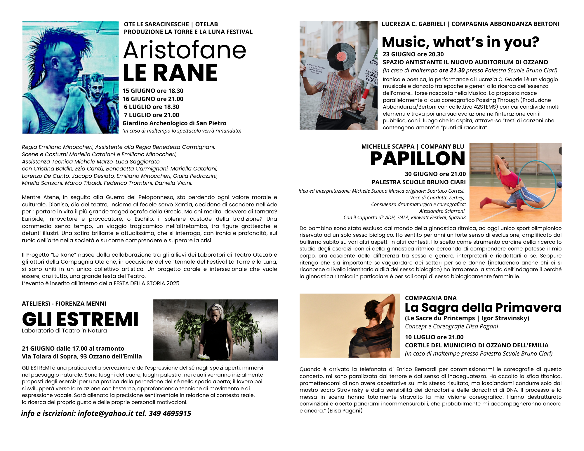 O.t.e. Ozzano Teatro Ensemble celebra questo importante traguardo con la messa in scena di un nuovo spettacolo in prima assoluta che aprirà il Festival: la commedia LE RANE da Aristofane. Un' importante produzione (in replica il 15 e 16 giugno e il 6 e 7 luglio presso il Giardino Archeologico di San Pietro) che vede sul palco, oltre agli attori di Ote Le Saracinesche, anche gli allievi dei Laboratori di Teatro OteLab, in un grande progetto intersezionale e di comunità.