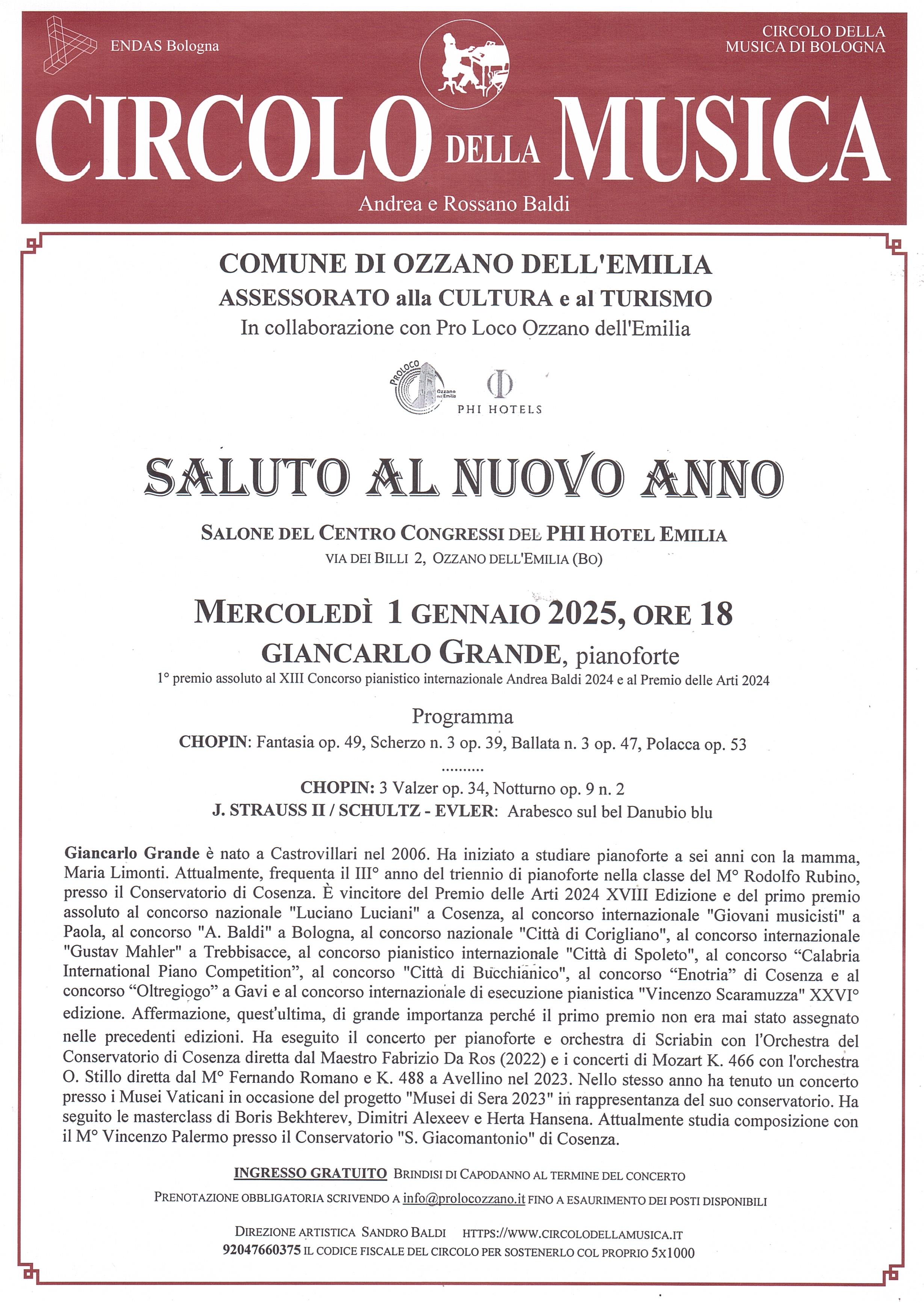 Musica per il nuovo anno! Dal Salone dorato degli stucchi del Musikverein di Vienna allo splendente Gran Teatro La Fenice di Venezia, sulle note di Verdi o degli Strauss, il concerto di Capodanno è senz’altro un classico dei nostri tempi. In effetti è molto piacevole ascoltare dal vivo della buona musica, magari non troppo impegnativa e orecchiabile, dopo aver fatto tardi la notte di San Silvestro. Non si sottrae alla bella tradizione la cittadina di Ozzano dell’Emilia che, grazie alla collaborazione dell’Assessorato alla Cultura e della Pro Loco col Circolo della Musica di Bologna, ripropone mercoledì 1 gennaio 2025 alle ore 18 al Salone dei Congressi presso il PHI Hotel Emilia in via dei Billi 2 a Ozzano dell'Emilia (ingresso libero) il tradizionale “Saluto al nuovo anno”, con l’esibizione del pianista GIANCARLO GRANDE, vincitore del XIII Concorso Pianistico Internazionale Andrea Baldi 2024, in musiche di Chopin e Strauss jr