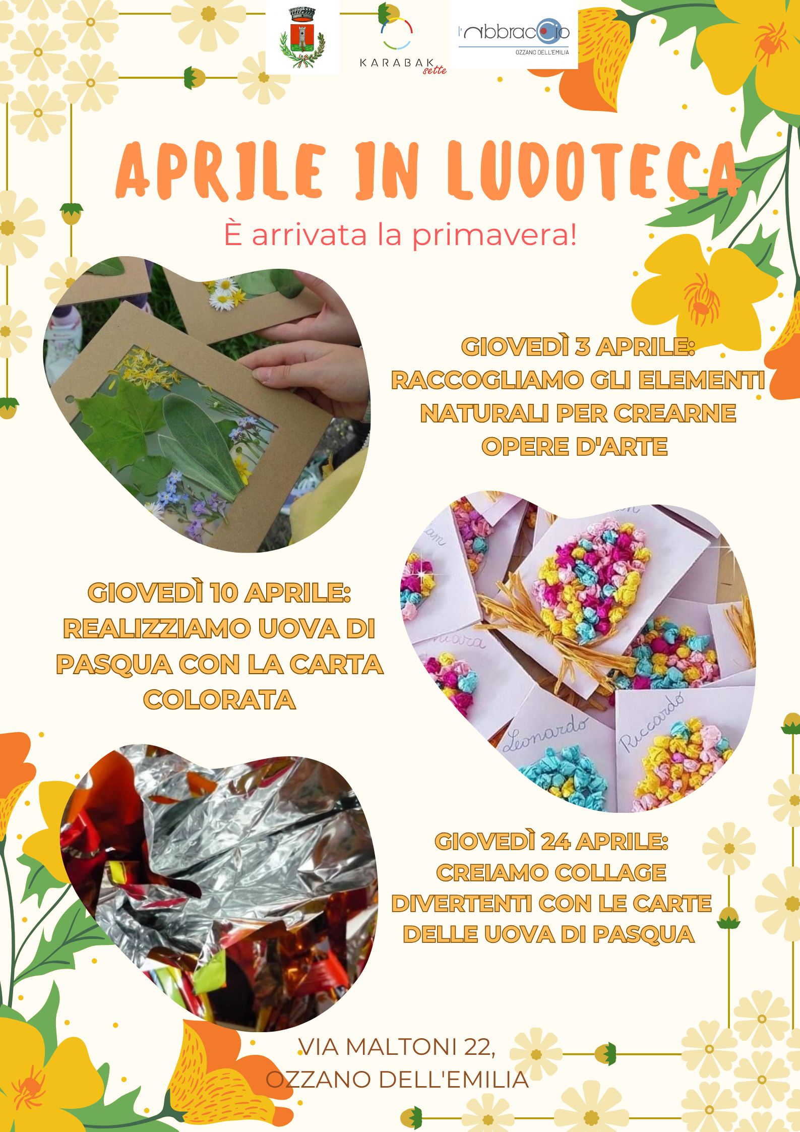 - dalle ore 16.30 alle ore 18.30 la Ludoteca (Via Maltoni 22-Ozzano) partecipa alla settimana ecologica e organizza un laboratorio di uova di Pasqua con carta colorata.